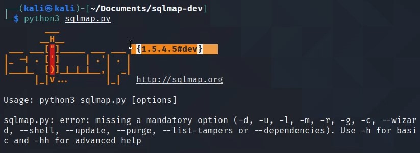 We can run this version by typing python3 sqlmap.py and we will see version 1.5.4.5#dev (you might see something slightly different depending on when you’re taking the course).